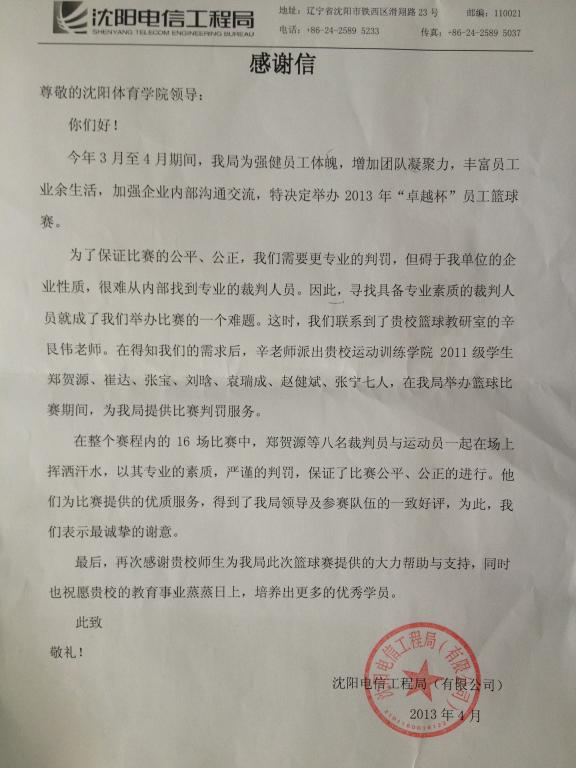 2013年3月—4月期间,沈阳电信工程局(有限公司)举办了2013“卓越杯”员工篮球赛,该单位与篮球教研室积极沟通并聘请公司运动训练专业2011级篮球裁判班员工为本次比赛做裁判服务工作。员工们的出色表现得到了该局领导及参赛队伍的一致好评,特送感谢信一封和锦旗一面。
