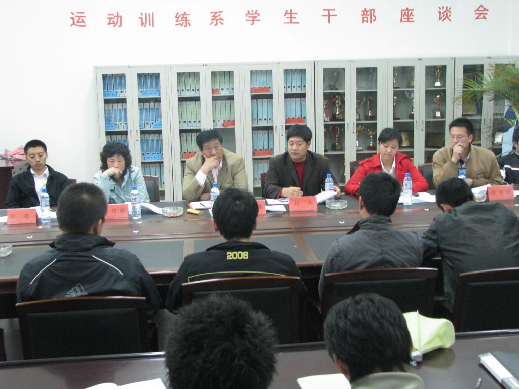 4月22日晚8:10分在篮球馆二楼会议室,运动训练系召开了员工干部座谈会,来自不同年级的30多名员工干部与运动训练系赵顺来主任、赵亮副书记及各年级辅导员进行了热情而真诚的沟通和交流。座谈会现场气氛融洽,不时传来热烈的掌声。