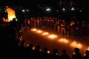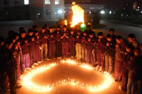 同学们在办公楼前广场中央用点燃的白色蜡烛围成“加油中国,加油四川!”的形状。接着,大家手捧点燃的蜡烛围成一颗“心”,以此来表达自己对突遇灾难同胞的哀悼之情。