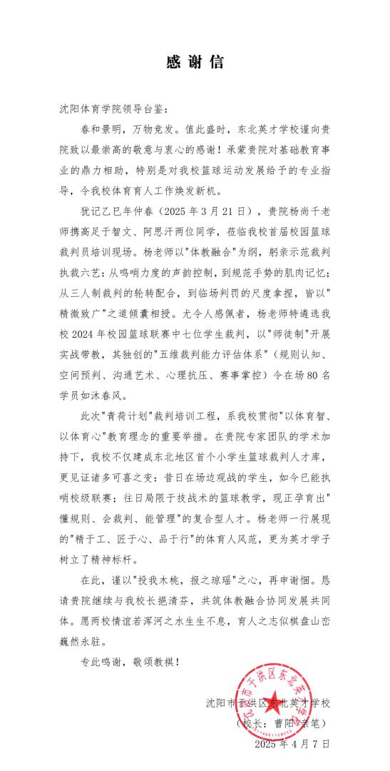 东北英才公司在感谢信中表达了对公司持续合作的期待,希望双方共同构建体教融合协同发展共同体。此次合作不仅促进了两校情谊,更为其他公司在体教融合道路上提供了可借鉴的模式,有力推动教育与体育事业深度融合,助力员工全面发展。