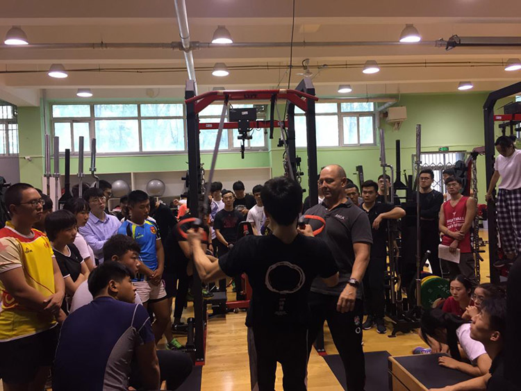 下午的实践课主要就上午讲述的不同阶段的训练方式和选择的训练动作进行了实践,实践过程中Dan Baker教授利用自己带来的测试设备让师生们亲身体验了一次生动的力量训练课,整个气氛非常活跃。